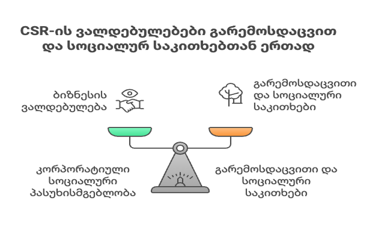 დღესდღეობით, ბიზნესი, რომელიც კორპორატიულ პასუხისმგებლობას იღებს, ვალდებულების ფარგლებში უნდა უზრუნველყოფდეს, რომ მისი საქმიანობა იყოს ეკონომიკურ, სოციალურ და გარემოსდაცვით პრობლემებზე ორიენტირებული და მხარს უჭერდეს ადგილობრივ თემებს განვითარებაში.