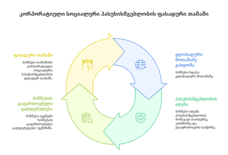 თანამედროვე ეკონომიკურ სისტემაში ბიზნესის როლი დიდწილად გასცდა მხოლოდ მოგების მიღებისა და გადასახადების გადახდის ფუნქციას. ის განიხილება როგორც საზოგადოებრივი პროცესის შემოქმედი და გავლენიანი მოთამაშე, რომელიც აგებს პასუხს არა მხოლოდ საკუთარ პარტნიორებზე და აქციონერებზე, არამედ საზოგადოებაზე, გარემოზე და მომავალ თაობებზე.