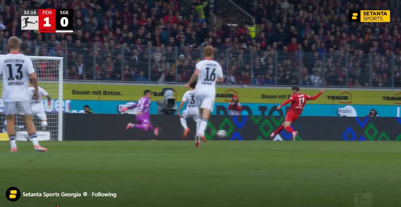 “ჰაიდენჰაიმის” ქართველმა შემტევმა “აინტრაჰტს” გაუტანა და თავისი გუნდი დააწინაურო, 1-0.