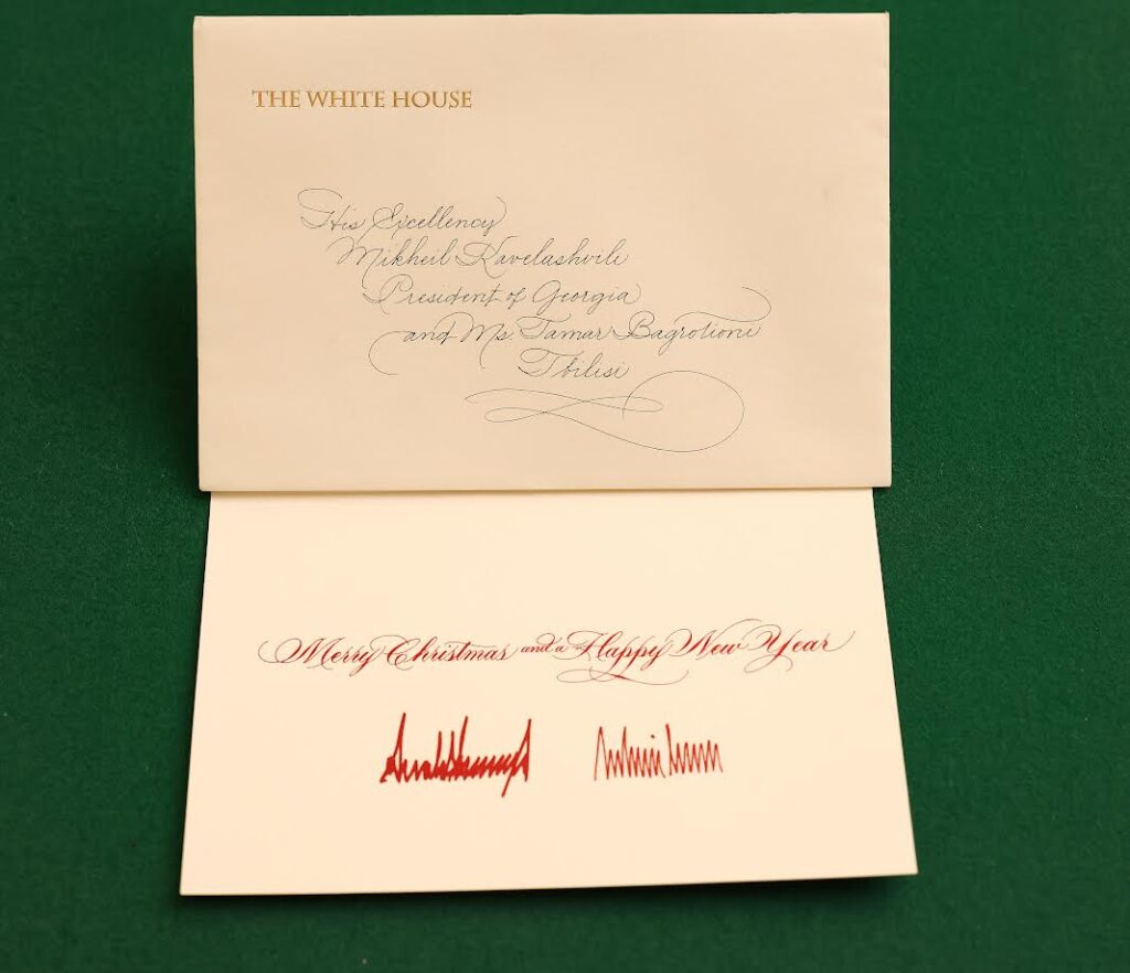 „მის აღმატებულება საქართველოს პრეზიდენტს, მიხეილ ყაველაშვილსა და ქალბატონ თამარ ბაგრატიონს ვულოცავთ შობა-ახალ წელს. დონალდ და მელანია ტრამპები“, – წერია საქართველოს პრეზიდენტის, მიხეილ ყაველაშვილის სახელზე გამოგზავნილ მისალოც ბარათში.