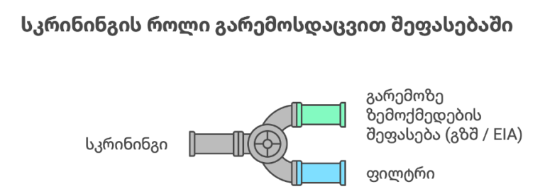 სკრინინგის პროცესში შესაბამისი სახელმწიფო უწყება განიხილავს პროექტის ტიპს, მასშტაბს, ადგილმდებარეობას და პოტენციურ გავლენას გარემოზე — ჰაერზე, წყალსა და ნიადაგზე, ბიომრავალფეროვნებაზე, ასევე ადამიანის ჯანმრთელობასა და სოციალურ გარემოზე.