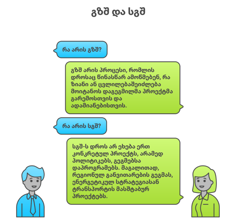 გზშ არის პროცესი, რომლის დროსაც წინასწარ ამოწმებენ, რა ზიანი ან ცვლილება შეიძლება მოიტანოს დაგეგმილმა პროექტმა გარემოსთვის და ადამიანებისთვის.